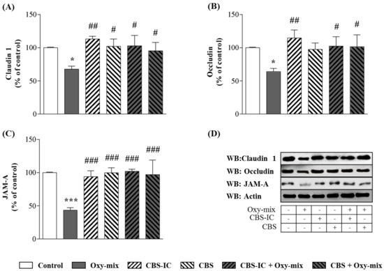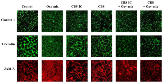 Differentiated CaCo-2 cell monolayers were incubated with 60 µM Oxy-mix for 24 h. Western Blotting analyses showed that Oxy-mix induced a significant decrease of all TJ levels, such a deranging effect being remarkable on JAM-A (Figure 2C). Immunofluorescence analysis underlined a clear TJ cellular delocalization after the Oxy-mix cell treatment (Figure 3). On the other hand, cell pretreatment with CBS-IC or CBS fully prevented the Oxy-mix-exerted decrease of TJ protein levels (Figure 2).