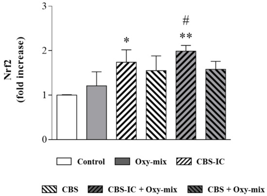 Differentiated cells were pretreated or not with CBS, CBS-IC for 1 h and incubated with Oxy-mix for 6 h. This incubation time corresponds to the significant maximum Nrf2 expression. In a group of experiments, cells were pretreated with 13 µM theobromine corresponding to its content in CBS-IC; pretreatments with 1 µM (−)-epicatechin were also inserted as positive controls.