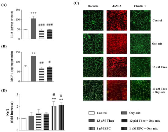 Theobromine prevented IL-8, MCP-1 and TJ changes but did not increase Nrf2 gene expression in differentiated CaCo-2 cells treated with Oxy-mix. Differentiated CaCo-2 cells were pretreated or not with 13 µM theobromine for 1 h and incubated with 60 µM Oxy-mix for 24 h. Cell release of IL-8 (A) and MCP-1 (B) in the incubation medium was detected by ELISA and evaluated. Values are shown as pg chemokines normalized for cell incubation medium mg proteins (pg/mg protein). Data are means of three independent experiments (n = 3) evaluated in triplicate ± SD. Claudin 1, occludin, and JAM-A cellular distribution (C) was evaluated in differentiated CaCo-2 cell lysates in presence of 13 µM theobromine (1 h cell pretreatment) incubated or not with 60 µM Oxy-mix for 24 h. Fluorescence microscopy was used to visualize TJ cellular distribution (×400 magnification). Claudin 1 and occludin proteins were visualized as green fluorescence, JAM-A was visualized as red fluorescence (see Materials and Methods). Nrf2 gene expression (D) was evaluated through qRT-PCR in differentiated CaCo-2 cells after 6 h Oxy-mix incubation in presence or absence of 13 µM theobromine. The histograms represent means of three independent experiments (n = 3) evaluated in triplicate ± SD, normalized to the corresponding housekeeping gene actin and expressed as fold induction vs. control. Theo: theobromine; EPC: (−)-epicatechin. Significance: Different vs. controls: ** p < 0.01, *** p < 0.001; different vs. Oxy-mix: # p < 0.05, ## p < 0.01, ### p < 0.001.