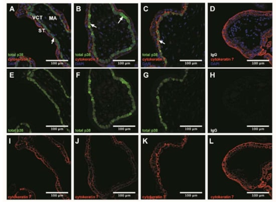 p38 immunodetection in 7–9 Gestational Weeks (GW) chorionic villi embedded in agarose sections. Total p38 was stained with green 488 AlexaFluor, nuclei were stained with DAPI and cytokeratin 7 with red 546 AlexaFluor. (A–D) Channels merge of total p38, cytokeratin 7 and DAPI staining; (E–H) Total p38 was shown in chorionic villi; (I–L) Structure of chorionic villi was marked with cytokeratin 7. IgG negative control is presented in (D,H,L). Confocal microscopy 400 x, scale bar 100 µm, n = 3 different placentas. ST, syncytiotrophoblast; VCT, villous cytotrophoblast; MA, mesenchymal axis.