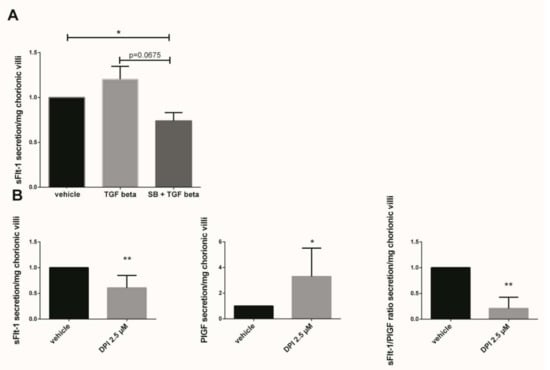 The sFlt-1 secretion was measured in first trimester chorionic villi supernatant cultured for 48 h with 10 ng/mL TGF-β1 or preincubated 1 h with 10 µM SB203580 followed with 48 h of 10 ng/mL TGF-β1. The results showed that the sFlt-1 increased by 1.2-fold when the chorionic villi were treated with TGF-β1 as compared with the vehicle group (Figure 5A, p = 0.1952, n = 7, vehicle: DMSO). When the villi were preincubated with the p38 inhibitor SB203580, the sFlt-1 secretion decreased by 1.6-fold as compared with the TGF-β1 group, but these results were not statistically significant (Figure 5A, paired t-test, p = 0.0675, n = 7 independent experiments). Interestingly, pre-incubation with p38 MAPK inhibitor significantly decreased the sFlt-1 secretion in chorionic villi supernatant as compared with the vehicle group (Figure 5A, paired t-test, p = 0.0308, n = 7, vehicle: DMSO), demonstrating the involvement of p38 MAPK in sFlt-1 secretion in our model. When first trimester chorionic villi were exposed to the Nox inhibitor DPI, the sFlt-1 secretion significantly decreases by 1.6-fold (mean +/− SD, 9949.25 +/− 3419.45 pg/mL versus 5569.00 +/− 2800.05 pg/mL, p = 0.0024), highlighting the involvement of Nox on sFlt-1 secretion (Figure 5B). The 2.5 µM DPI treatment on first trimester chorionic villi led to a significant increase by 3.3-fold in PlGF secretion (mean +/− SD, 39.96 +/− 12.89 pg/mL versus 93.89 +/− 51.86 pg/mL, p = 0.0218) and therefore to a significant decrease by 3.2-fold in the sFlt1/PlGF ratio when Nox was inhibited (Figure 5B, p = 0.0078, n = 8, vehicle: DMSO).
