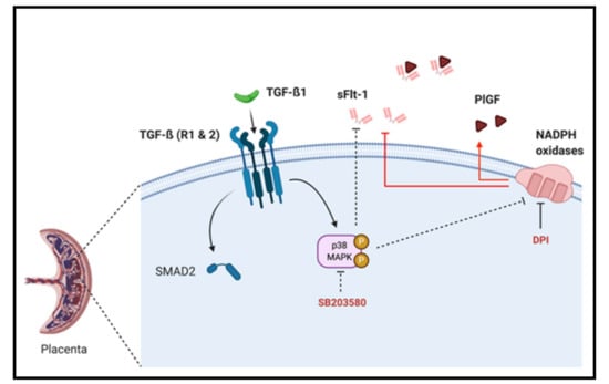 Schematic representation of TGF-β1/Nox/p38 MAPK mediated sFlt-1 secretion in first trimester chorionic villi. p38 MAPK can be activated by TGF-β1 and blockade of its activation decreases sFlt-1 secretion and placental Nox activity, and its activation is independent of TGF-β1 canonical pathway second messenger SMAD2. The modulation of the sFlt-1/PlGF angiogenic balance is under the control of Nox activity as its inhibition using DPI decreases sFlt-1 and increases PlGF secretions.