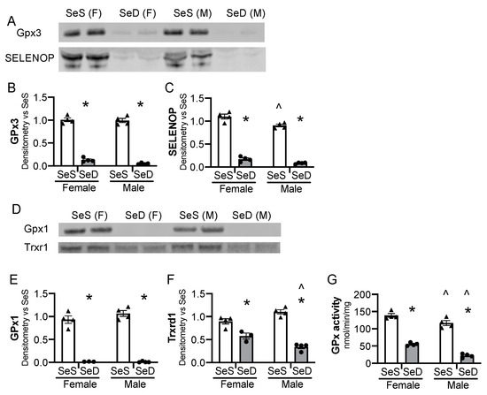 - Riese, C.; Michaelis, M.; Mentrup, B.; Götz, F.; Köhrle, J.; Schweizer, U.; Schomburg, L. Selenium-dependent pre- and posttranscriptional mechanisms are responsible for sexual dimorphic expression of selenoproteins in murine tissues. Endocrinology 2006, 147, 5883–5892. [Google Scholar] [CrossRef]