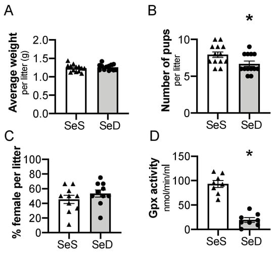 3.2. Antenatal Se Deficiency Decreases Litter Size and Circulating GPx Activity in Neonatal Mice
