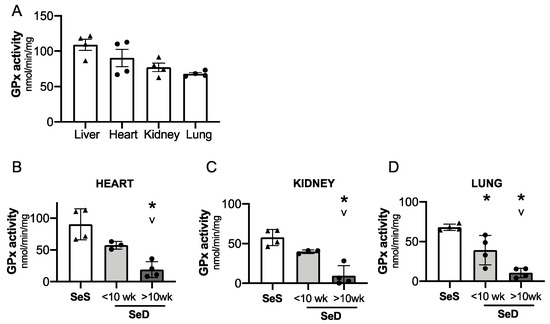 3.7. Neonatal GPx Activity in the Heart, Kidney, and Lung Is Variably Decreased Depending on Duration of Antenatal Se Deficiency