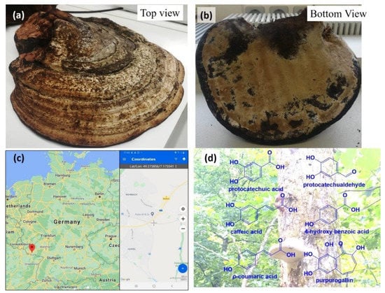 A fine specimen of the fruiting body of tinder conk Fomes Fomentarius weighing 2122.17 g before and 826.68 g after drying as shown in (a) and (b) was collected in the woodland surrounding the town of Hassel/Saar in Saarland, Germany, as highlighted on the map of Germany in (c) (credit Google Maps). Its botanical identity was determined by Dr Martin C. H. Gruhlke at the Department of Plant Physiology at RWTH Aachen, Aachen, North Rhine-Westphalia and the samples of sponge were processed further as part of this study. A section of active ingredients commonly found in such sponges as described in the literature is shown in (d) [,].