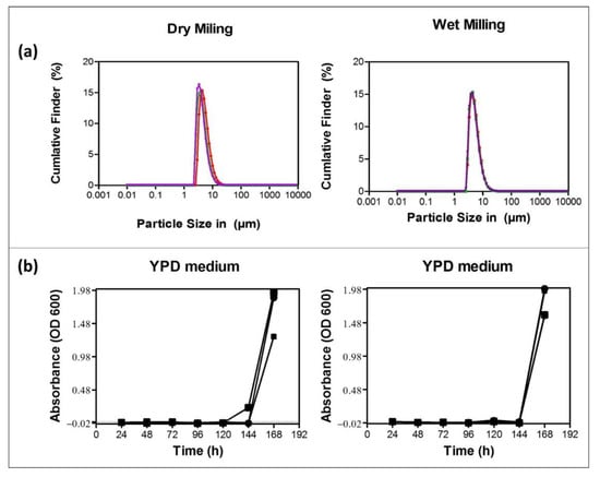 Physical and microbial analysis of the dry milled powders and wet milled suspensions confirm small particles with diameters in the range of 1 to 10 µm, as shown in (a), and a notable sterility of these samples in yeast peptone dextrose (YPD) media for up to six days as indicated in (b). Similar results were obtained once lysogeny broth (LB) medium was used rather than YPD medium.
