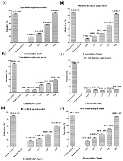 In the case of the wet milled sample, a similar activity was observed, with 91% of radicals scavenged at a concentration of 0.16% w/v and an estimated IC50 value of around 0.04% w/v as shown in Figure 4d. As in the case of the dry milled sample, most of the activity is associated with the particles themselves, as after centrifugation the supernatant scavenges only around 20% of radicals, whereas the resuspended pellet containing the particles neutralizes 89%, as illustrated in Figure 4e and f, respectively. This relation between supernatant and particle does not change much over a 24 h period, possibly due to the fact that liberation of soluble materials was largely accomplished already during the harsh conditions and elevated temperatures associated with wet milling, as shown in Figure S1 in the Supplementary Material.