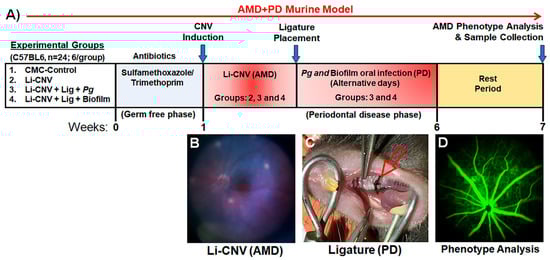 To test the influences of Pg or biofilm consortium members in pathological neovascularization, we established the ligated periodontitis model [72,73] with the Li-CNV (wet AMD) mouse as described above, 3 days post laser treatment. This model emulates the human AMD+PD. The animals underwent general anesthesia with a combination of ketamine/xylazine (80 mg/kg + 5 mg/kg body weight, respectively) administered via intraperitoneal injection. The ligature model was obtained by placing a sterilized 5–0 silk thread (Roboz Surgical Instrument Co., MD, USA) around the maxillary upper-left second molar and tied mesiobuccally for groups 3. Li-CNV+Lig+Pg and 4. Li-CNV+Lig+Bio to compare to the untreated groups (1. CMC control, 2. Li-CNV control—no ligature or bacteria). Suture was applied and tied gently to prevent damage to the periodontal tissue. The ligatures remained in place in all mice throughout the experimental period without the necessity of replacement. Mice were challenged by oral application of vehicle (2% CMC in PBS, no bacteria) or the P. gingivalis alone and biofilm (1 × 109 CFU) at the buccal surface of the maxillary vestibule for 6 weeks on alternative days with 1 week of rest before study completion. Mice were analyzed noninvasively by fundus photography, Optical coherence tomography, and fluorescein angiography at 1 and 6 weeks as described below. After 6 weeks of chronic infection, mice were sacrificed at the 7th week, and the eyes were removed for RNA isolation, H&E, and immunostaining analysis (Figure 1).