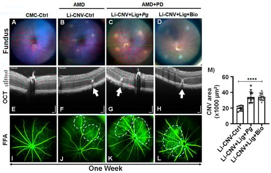 The noninvasive fundus image showed laser-burn spots in Li-CNV, Li-CNV+Ligature+Pg, and Li-CNV+ Ligature+ Biofilm-infected groups compared to CMC control (Figure 2 A–D) at one week. The spectral domain optical coherence tomography (SD-OCT) further confirmed the rupture of Bruch’s membrane induced by laser burn compared to CMC (−ve)-control (Figure 2E–H; Figure S1D,H,L). We also observed reduced retinal thickness in biofilm-infected mice retinae compared to CNV and CMC control (Figure 2H; Figure S1K,L). Next, we analyzed induction of vascular leakage in AMD+PD mice retinae by fundus fluorescein angiography (FFA). The FFA found pronounced blood leakage in both ligature-enhanced P. gingivalis infection (alone) and biofilm-infected Li-CNV mice retinae at 1 week compared to CNV and CMC controls (Figure 2I–L). The quantification analysis of CNV areas showed significant increase in AMD+PD compared to CNV control retinae at one week (Figure 2M). This data connotes that PD induces vascular modifications even within a short duration of one week.