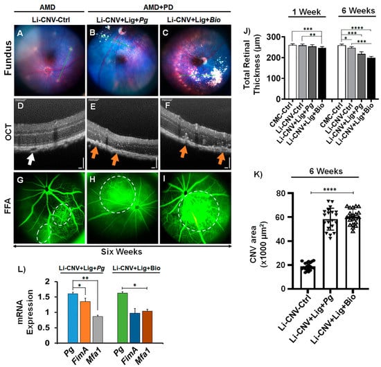 Progression of AMD pathogenesis through oral pathogens in AMD+PD mice retinae. Representative images of fundus (A–C), SD-OCT (D–F), and FFA (G–I) after 6 weeks of Li-CNV-Ctrl (A,D,G), Li-CNV+Lig+Pg (B,E,H) and Li-CNV+Lig+Bio (C,F,I) infected mice retinae, respectively. (A–C) Fundus shows increased chronic CNV lesions and drusen-like deposits in chronic Pg- (B) and biofilm (C)-infected retinae compared to CNV-control (A). Refer to Figure S2 for another set of representative fundus images. The green lines indicate the scan lines for the OCT sections. (D–F) OCT images further confirm chronic CNV lesion and drusenoid deposits located above the RPE in Pg- (E) and biofilm (F)-infected retinae after 6 weeks with obvious reduction in retinal thickness and predominant vitreal (refer to Figure S2H,M, blue arrow) and subretinal angiogenesis compared to CNV control (D, white arrow). Representative OCT scans show multiple subretinal and cuticular drusen-like depositions (orange arrows). Refer to the low magnification in Figure S2 for a complete view. (G–I) FFA shows increased blood leakage (dotted white circle) after 6 weeks compared to CNV and 1 week (Figure 1J–L). Refer to Figure S2 for another set of representative FFA images. (J) Quantification of total retinal thickness in Pg- and biofilm-infected mice at 1 and 6 weeks, compared to CMC and CNV controls. Total retinal thickness measured from the nerve fiber layer to the RPE layer. Mean ± SEM analyzed by one-way ANOVA followed by Tukey’s multiple comparisons test (n = 24; **** p < 0.0001; *** p < 0.001; and ** p < 0.01). (K) Quantification analyses show increased CNV areas in Pg- and biofilm-infected mice retinae after 6 weeks compared to CNV control. Mean ±SEM analyzed by one-way ANOVA followed by Dunnett’s multiple comparisons test (n = 18, **** p < 0.0001). (L) qPCR shows mRNA expression of Pg, FimA, and Mfa1 in Pg alone and biofilm orally infected mice retinae and untreated controls, normalized with the internal (universal 16S-rRNA) control and compared to Pg vs. Mfa1 and FimA genes (n = 12; ** p < 0.01).