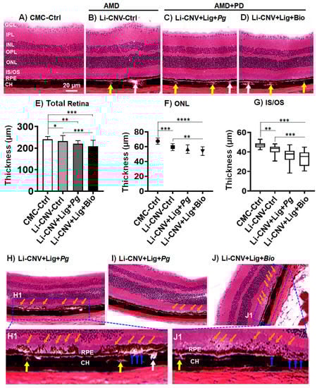 Laser-induced CNV causes retinal degeneration in mouse models [77]. However, it remains unknown whether PD plays a role in the aggravation of the retinal degeneration in pre-existing AMD animal models. To explore this, we utilized the AMD+PD mice model and investigated the morphology of the retinae by OCT imaging and quantified by ImageScope analyzer for 1 and 6 weeks. We found that, at the first week of infection, the thickness of the retinae of Li-CNV+Lig+Biofilm was significantly reduced compared to CMC and CNV controls (Figure 2J; 1 week). While at 6 weeks of chronic infection, the thickness of the retinae of both Pg and biofilm were significantly reduced (Figure 2J; 6 weeks). There was also a significant progressive decrease, falling to 99/94, and 94/76 % of controls at 1, and 6 weeks, respectively (Figure 2J). To substantiate the reproducibility of the retinal thickness reduction in AMD+PD mice, we further analyzed the H&E retinal sections after 6 weeks at the completion of the experiments. H&E sections showed significant reduction in retinal thickness in AMD+PD mice compared to CMC and CNV control (Figure 4A–E; Figure S3A–D). In addition, we also observed morphological variations including thickening of Bruch’s membrane and abnormal alteration of RPE layer in Pg and biofilm infected mice retinae (Figure 4C,D; Figure S3C,D). Thinning was observed in nearly all the retinal layers, including inner segment/outer segment (IS/OS), outer nuclear layers (ONL) of Pg and biofilm infected were significantly reduced (Figure 4F,G). This result was consistent with the noninvasive OCT imaging analysis (Figure 2J; 6 weeks). These data suggest that infection with oral pathogens can exacerbate the retinal degeneration in pre-existing AMD mice.