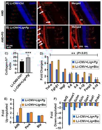 Increased choroidal/retinal vasculogenesis, oxidative stress, inflammatory mediators, and decreased antioxidants genes in the retinae of AMD+PD mice. (A–C) Immunofluorescence staining shows more Col-IV (angiogenic/vascular marker) in the AMD+PD mice retinae and choroidal region compared to CNV control (A). (B) white arrows indicate newly formed blood vessels. Note: Refer to Figure S4 for another set of representative images. (C) Quantification analysis shows increased Col-IV+ cells in Li-CNV+Lig+Pg-infected retinae, relative to Li-CNV group. Two groups were compared, and data were analyzed using unpaired Student’s t test (n = 6; *** p < 0.001). (Scale bar: 20 µm). (D–F) qPCR shows up-regulation of pro-inflammatory (D), oxidative stress (E) genes and down-regulation of anti-inflammatory mediators (D) and antioxidants (F) in Li-CNV+Lig+Pg, and Li-CNV+Lig+Bio relative to the average of CNV and CMC controls. Fold change in gene expression normalized with internal controls, and ±1.5 fold was considered significant (n = 6, ** p < 0.01).