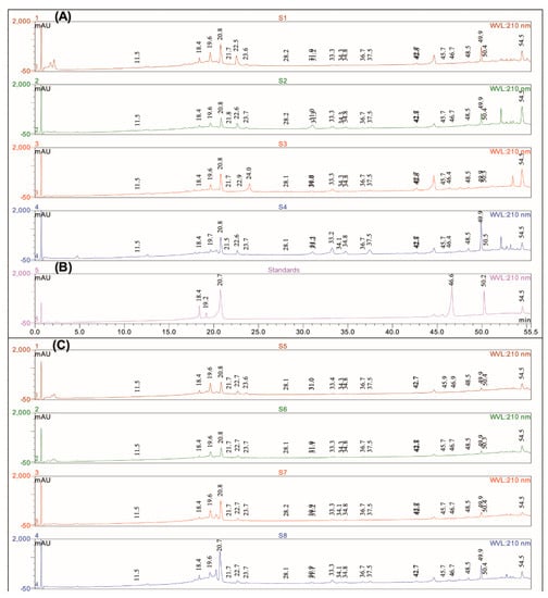 2.6. High Pressure Liquid Chromatography-Diode-Array Detection-Electrospray Ionization-Quadrupole-Mass Spectroscopy (HPLC-DAD-ESI-Q-MS) Compounds Profiling