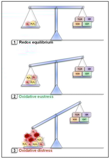 The redox status of the cell is influenced by ROS production on the oxidative side and the antioxidant defense system on the reductive side. (1) If ROS producing and eliminating factors are in equilibrium, redox balance is achieved, which represents the normal status in cells. (2) ROS production can be increased and exceed the capacity of the antioxidant defense system. If excess ROS fulfill important cellular functions, this is called oxidative eustress. (3) Continuous ROS production beyond the level required for cellular functions leads to oxidative damage and is called oxidative distress. Thioredoxin reductase (TrxR), glutathione reductase (GR), superoxide dismutase (SOD), catalase (CAT).