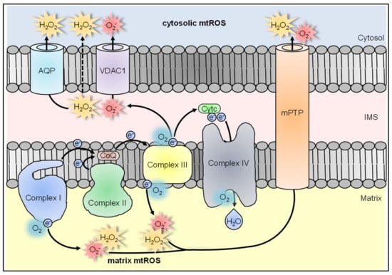 Electrons are shuttled from NADH and FADH2 through the four complexes I-IV of the electron transport chain (ETC) and the electron carriers coenzyme Q (CoQ) and cytochrome c (Cyt c). Mitochondria generate ROS mainly through complexes I and III. Matrix-derived O2●− and H2O2 can only reach the cytosol after mitochondrial permeability transition pore (mPTP) opening or damage caused to mitochondrial membranes. From the intermembrane space (IMS), H2O2 can reach the cytosol through diffusion or aquaporins (AQP), whereas O2●− can cross the outer mitochondrial membrane only through membrane channels such as voltage-dependent anion channels (VDAC).