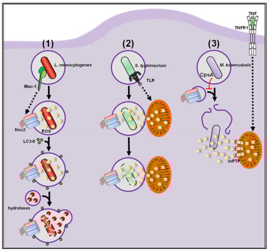 (1) During infection with L.m., tissue macrophages activate a highly antimicrobial phagocytic pathway called LC3-associated phagocytosis (LAP). LAP induction strictly depends on production of extracellular ROS by Nox2, which induces the eponymous recruitment of LC3 to phagosomes. These so-called LAPosomes show enhanced fusion with lysosomes, leading to improved killing of L.m. by macrophages. (2) S.t. can evade degradation in the phagosome by using oxidative stress for their benefit. ROS production by Nox2 contributes to S.t. killing but, on its own, is not sufficient for complete eradication of the pathogen. Mitochondria are recruited as additional ROS source via Toll-like receptor (TLR) signaling to overcome the antioxidative capacity of S.t. resulting in its degradation. (3) Mtb inhibits Nox2-mediated ROS production and subsequent LAP induction through its virulence factor CpsA and quickly escapes into the cytosol. Macrophages activate excessive production and release of mtROS through the mitochondrial permeability transition pore (mPTP) via TNF receptor 1 (TNFR1) signaling to combat cytosolic Mtb.
