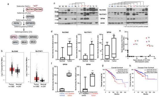 As xCT activity was shown to drive the expression of the selenoprotein GPX4 via the selenocysteine biosynthesis pathway (Figure 1a, [4]), we examined the levels of SLC7A11, SLC3A2, and GPX4 in breast normal and cancer tissues to confirm if this pathway is altered in cancer tissues and if GPX4 expression is associated with the expression of xCT. First, we analyzed normalized mRNA transcript levels of SLC7A11 and SLC3A2 from data from The Cancer Genome Atlas (TCGA) compared with normal tissues from (GTEx), using the web tool GEPIA [10], which demonstrated a trend towards increased mRNA levels which was not significant (Figure 1b); similar non-significant trends for increase in both subunits was observed in data mining across multiple cancer types (Supplementary Figure S1a). When directly examining protein levels from patient-derived breast tumor samples and normal breast tissues, we found that the expression levels of the xCT subunits, SLC7A11 and SLC3A2, were significantly upregulated in breast tumor tissues compared with normal tissues (Figure 1c,d). xCT requires both these subunits [4], thus we tried to distinguish between tissues that express only one or both of the subunits. Interestingly, there were 6 cancer tissues out of 14 that expressed significant levels of both SLC7A11 and SLC3A2, which we designated xCT positive tissue (Figure 1e), while none of the normal breast tissues was xCT positive (Figure 1c). Interestingly, when comparing expression across all tumor samples versus all normal tissue samples, in contrast to SLC3A2 and SLC7A11, GPX4 was not significantly overexpressed in cancer tissues compared to normal tissues across the set (Figure 1d). In contrast, when directly comparing the protein expression levels of GPX4 in xCT-positive tumors with their paired (i.e., from the same patient) normal breast tissue, or comparing all xCT positive tumors tissues with all xCT-negative tumor tissues, we saw statistically significant increases of GPX4 expression in the xCT positive group (Figure 1f). Furthermore, analyses of TCGA data indicated that high expression of both subunits of xCT was significantly associated with poor overall survival (Figure 1g) and disease-free survival (Figure 1h) in patients with breast cancer. In contrast, expression of either SLC7A11 or SLC3A2 alone did not have significant prognostic value (Supplementary Figure S2a,b). These findings support the notion that xCT drives the expression of GPX4 [4], and that the elevated expression of both SLC7A11 and SLC3A2 is a determinant for increased xCT function as indicated by GPX4 expression—And is associated with poor prognosis in breast cancer.