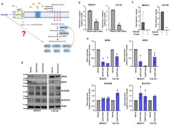 Erastin downregulates the expression of GPX4 and GPX1 via inhibition of selenium uptake. (a) Schematic diagram of the proposed role of xCT in the selenoprotein synthesis pathway. Created with Biorender (https://app.biorender.com/). (b) Total thiol quantification of conditioned media from vehicle or 6 µM Erastin treated MDAMB231 and CAL120 cells, conditioned for 12 h. Each value was normalized to that of unconditioned medium (UCM), set to 1. (c) Selenium uptake in vehicle or Erastin-treated CAL120 and MDAMB231 cells. Total intracellular selenium levels were measured following treatment with 12 µM selenite and/or Erastin for 2 h. (d) Immunoblots of GPX1, GPX4, SLC3A2, SLC7A11, and Actin in 3 µM, 6 µM Erastin or vehicle-treated cells for 48 h. (e) Quantification of actin-normalized band intensities of GPX4, GPX1, SLC3A2 and SLC7A11 relative to the vehicle, from multiple experiments. Error bars represent the mean ± s.d. (n = 3). Three independent experiments were performed for b and c and each experiment contains three biological replicates. The bars for b represent the mean ± s.d. of averaged values from each experiment. The bars for c are the mean ± s.d. of biological triplicates from a representative set. Data marked with a three (***) asterisks indicate p values of <0.001.