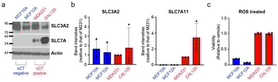 The role of xCT in driving both glutathione production and the expression of glutathione-utilizing enzymes such as GPX4 suggests that its expression may promote survival under oxidative stress conditions for breast cancer cells that have elevation in xCT expression. We first identified two TNBC cell lines, MDAMB231 and CAL-120, as having increased expression of both SLC7A11 and SLC3A2, while two commonly used non-transformed mammary epithelial lines, MCF10A and MCF12A, were found to express only SLC3A2 but not SLC7A11, and are thus xCT-negative (Figure 3a,b). Next, we found that the breast cancer lines were highly resistant to death induced by hydrogen peroxide (Figure 3c). This suggests that xCT-positive breast cancer cells have a selective advantage against oxidative stress.