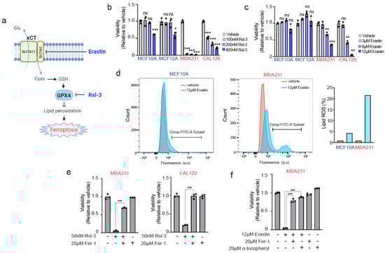 xCT/GPX4 suppression of ferroptosis is required in transformed, xCT-positive breast cancer cells but not in non-transformed breast cells. (a) Schematic diagram of a known working mechanism of Erastin and Rsl-3. Created with Biorender (https://app.biorender.com/) (b,c) The relative viabilities of Rsl-3 (b) and Erastin (c) treated non-transformed breast and breast cancer lines. The viabilities were measured at 24 h and 72 h after treatment of Rsl-3 and Erastin, respectively; values are relative to vehicle-treated control for each cell line (=1.0) (d) FACS analysis of Bodipy 581/591 C11 lipid oxidation in vehicle and Erastin treated MCF10A and MDAMB231 cells. The Bodipy staining was performed at 72 h after Erastin treatment. Red and Blue indicate vehicle and Erastin treatment conditions, respectively. Comp-FITC-A subset was defined as a lipid ROS positive cells, which is indicated in the right bar graph. (e) The viabilities of breast cancer lines treated with Rsl-3 and/or the lipophilic antioxidant/ferroptosis inhibitor ferrostatin-1 (Fer-1). The viabilities were measured at 24 h after treatment of the indicated compounds. (f) The viabilities of MDAMB231 treated with Erastin and/or lipophilic antioxidants (ferrostatin 1, α-tocopherol). The viabilities were measured at 72 h. Three independent experiments were performed for (b,c,e,f) and each experiment contain three biological replicates. The bars for (b,c,e,f) are the mean ± s.d. of biological triplicates from a representative set. Data marked with a one (*), two (**) or three (***) asterisks indicate p values of <0.05, <0.01 and <0.001. ns: no significance.
