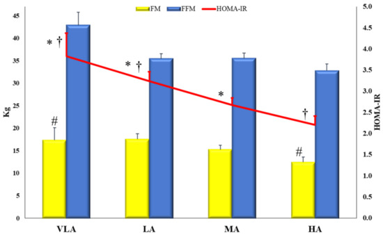 Fat mass, fat-free mass and HOMA-IR according to Physical Activity-Sedentarism Score (PASS) groups in Spanish children from the GENOBOX study. FM: fat mass; FFM: fat-free mass; HOMA-IR: homeostasis model assessment-insulin resistance; VLA: very low active; LA: low active; MA: moderately active; HA: high active. Differences between PASS levels were analyzed using one-way ANCOVA, adjusting for age and/or BMI z-score; pairwise differences were assessed by post hoc analyses to determine differences between experimental groups. For those variables not following normality, a Kruskal–Wallis test was used to evaluate differences between groups. FM: # Differences between the HA and VLA of (p = 0.003). HOMA-IR (UNIANCOVA, p=0.005): † Differences between HA vs. LA and VLA (p = 0.018 and p = 0.010, respectively); * Differences between A vs. LA and VLA (p = 0.014 and p = 0.010, respectively). p for trend for HOMA-IR (p = 0.001) and FM (p = 0.044).