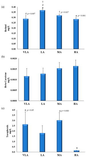 (a) Plasma retinol, (b) beta-carotene, and (c) tocopherols levels according to the Physical-Activity-Sedentarism Score (PASS) levels in Spanish children from the GENOBOX study. PA: physical activity; VLA: very low active; LA: low active; MA: moderately active; HA: high active. Differences between PASS levels were analyzed using one-way ANCOVA, adjusting for age and/or BMI z-score; pairwise differences were assessed by post hoc analyses to determine differences between experimental groups. For those variables not following normality, a Kruskal–Wallis test was used to evaluate differences between groups. * Differences with HA; # Differences with VLA; † Differences MA. p for trend for retinol (p = 0.043) and tocopherols (p = 0.040).