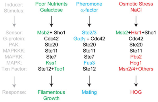 - Saito, H. Regulation of cross-talk in yeast MAPK signaling pathways. Curr. Opin. Microbiol. 2010, 13, 677–683. [Google Scholar] [CrossRef]
