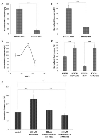 The third condition was experiments interrogating the actin cytoskeleton. We have previously shown that a ∆yno1 strain is sensitive to the addition of wiskostatin [5]. Wiskostatin was shown to interact with the evolutionary highly conserved protein N-WASp (isolated from Xenopus laevis eggs) thus interfering with F-actin polymerization [61]. Treating cells harboring the Yno1p reporter with wiskostatin led to an increase in GFP signal. Several wiskostatin concentrations were tested in a range from 50–300 µm wiskostatin and a peak was reached at a concentration of 150–200 µM with a >60% increase in GFP fluorescence. In a petite strain, the difference was even more striking, which showed an~8-fold increase in the expression of the PYNO1 ∆yno1::GFP-HIS3 construct (Figure 2D). Under the described conditions, addition of either 0.5 or 1 mM H2O2 reduced the expression of GFP to the same levels as seen in control cells (Figure 2E).