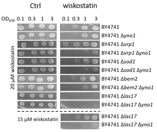The sensitivity of mutants to wiskostatin by spot test analysis. Serial dilutions (OD600 of 3, 1, 0.3, and 0.1) of the strains BY4741, BY4741 ∆yno1, BY4741 ∆vrp1, BY4741 ∆sod1, BY4741 ∆bem2, BY4741 ∆las17, BY4741 ∆yno1 ∆vrp1, BY4741 ∆yno1 ∆sod1, BY4741 ∆yno1 ∆bem2, and BY4741 ∆yno1 ∆las17 were spotted on SC-glucose plates, SC-glucose +20 µM wiskostatin plates and SC-glucose +15 µM wiskostatin plates. At least three biological replicates were tested on plates containing concentrations of wiskostatin in a range from 0–100 µM. Representative images and concentrations were chosen.