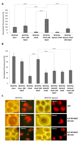 It has been reported that salt stress interferes with the cell cycle, leading to growth arrest and ultimately the apoptosis of yeast cells [66]. In subsequent studies, it was shown that in this case programmed cell death is not accompanied by increased ROS levels. Such elevated ROS levels were only observed in specific deletion mutants (e.g., a Δsro7 strain) [67]. Our analysis confirmed this finding. Addition of 1 M NaCl did not lead to a significant increase in superoxide levels in the BY4741 background (Figure 4A). In contrast to the situation in the wild type strain, the absence of mitochondrial DNA and, thus, mitochondrial respiration led to a high response to the addition of NaCl.