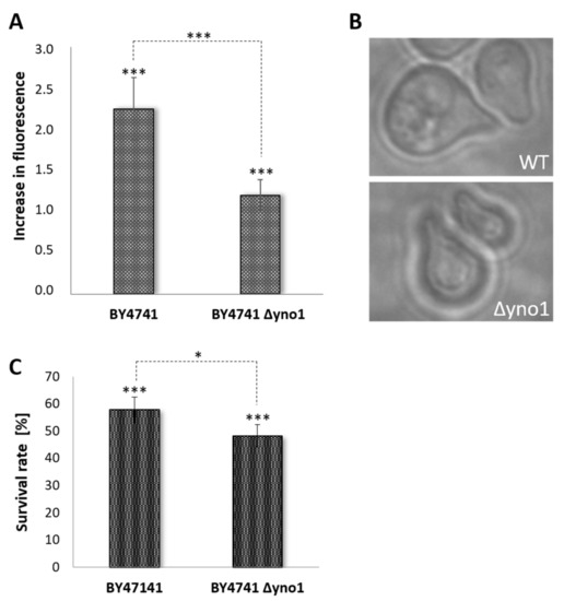 Surprisingly, the formation of shmoos (Figure 5B) was not affected by a deletion of YNO1. Although the ROS level decreased in the ∆yno1 deletion background, the survival rate was not increased, but on the contrary slightly decreased when compared to the wild type (Figure 5C). Confirming the results of Severin and Hyman [34], an overdose of alpha factor initiates a process that kills approximately 50% of cells independent of the genetic background.