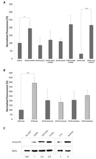 In addition to regulating the HOG pathway and the response to pheromone, Cdc42p and Ste20p also regulate the filamentous growth pathway [46], which is one of the signaling pathways that induces invasive/filamentous growth in response to nutrient limitation [27]. Filamentous growth in yeast can be induced in several ways. “Fusel” alcohols, such as isoamyl alcohol (IAA), can induce filamentous growth [73,74], as does growth in non-preferred carbon (e.g., galactose) [75] and nitrogen sources [46]. Both 0.5% isoamyl alcohol (IAA) (Figure 6A) and 2% galactose (Figure 6B) induced the Yno1p reporter (of PYNO1 ∆yno1::GFP-HIS3). To confirm this result, YNO1 was genomically tagged with GFP (BY4741 YNO1-GFP::HIS3) and analyzed by immunoblot analysis. Galactose or IAA treatment caused an increase in the level of Yno1p-GFP (2.5-fold and 9 fold, respectively) (Figure 6C). Deletion of STE20 caused a reduction in Yno1p expression in SC-galactose media (Figure 6B). An Yno1p reporter signal was still detectable in the ∆ste20 background after addition of IAA. A downstream target of the yeast MAP kinase cascade consisting of several serine/threonine kinases (Ste20p → Ste11p → Ste7p → Kss1p) are the transcription factors Tec1p and Ste12p [27]. Similar to Msn2p, Ste12p is predicted to bind to the YNO1 promoter region [41,76]. Under the induction conditions tested (galactose and IAA), deletion of STE20 resulted in reduced YNO1 expression (Figure 6A,B). This result indicates that YNO1 expression may be regulated by the MAP kinase cascade that regulates filamentous growth.