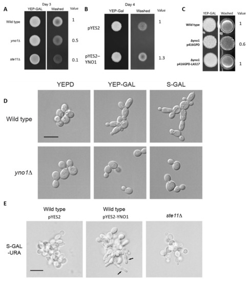 Filamentous growth is accompanied by an elongated morphology that results from a delay in the G1 and G2-phases of the cell cycle, a change in cell polarity, and enhanced cell–cell adhesion mediated by the adhesion/flocculin Flo11p. Collectively, these and other changes promote increased invasion of cells into substrates [27,74]. Due to the fact that filamentous growth is strictly dependent on Flo11p [77], and endogenous FLO11 expression is low in BY4741 [78], the filamentous strain background (Σ1278b) was chosen for further experiments [46]. The YNO1 gene was disrupted in an otherwise wild type filamentous strain by homologous recombination of a PCR-amplified KlURA3 cassette containing primer sequences to direct integration at the YNO1 locus. As a first test, the plate-washing assay [79] was performed to test the role of Yno1p in filamentous growth. Yeast cells can penetrate semi-solid agar media and are resistant to removal from agar plates by rinsing with water, by an assay called the plate-washing assay [22]. By this test, the ∆yno1 strain was defective for invasive growth (Figure 7A).
