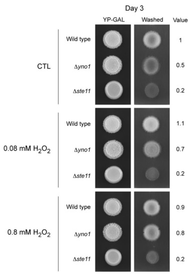 The effect of hydrogen peroxide on invasive growth of the ∆yno1 mutant alongside control strains. Wild type cells (PC538), the ∆yno1 mutant (PC7010) and the ∆ste11 mutant (PC3861) in the ∑1278b strain background were spotted onto YEP-GAL media containing the indicated concentrations of H2O2 for 3 days at 30 °C. Plates were photographed, washed, and photographed again. Invasive growth was quantified by ImageJ analysis.