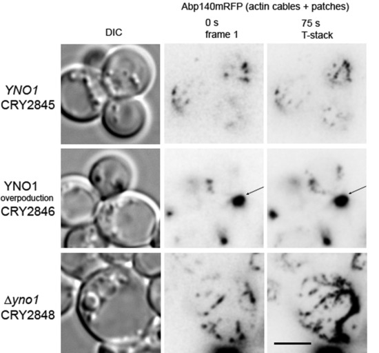 The effect of Yno1p on F-actin distribution at the cell cortex. F-actin structures were visualized by expression from an Abp140-mRFP fusion protein that is integrated into the chromosome. The strains CRY 2845 (MATa SY3089 ste4 FUS1-lacZ FUS1-HIS3 ura3-52; pYES ABP140-RFP-T rho0), CRY 2846 (MATa SY3089 ste4 FUS1-lacZ FUS1-HIS3 ura3-52; pYES YNO1 ABP140-RFP-T rho0), and CRY 2848 (MATa SY3089 ste4 FUS1-lacZ FUS1-HIS3 ura3-52; yno1::KIURA3 ABP140-RFP-T rho-) were grown in synthetic SC-Ura medium and analyzed after addition of 3% galactose for 7 h. Dynamics of F-actin structures was expressed as a T-stack (superposition of 15 images of the cortical F-actin taken in 5 sec intervals). For each strain at least 3 biological and more than 100 cells were inspected. In the strain CRY2845 small actin patches were observed, whereas in the strain CRY2848 there was a prevalence for cortical actin cables. In strain CRY2846, static F-actin bodies of large size are frequently formed (arrow). Bar, 5 μm.