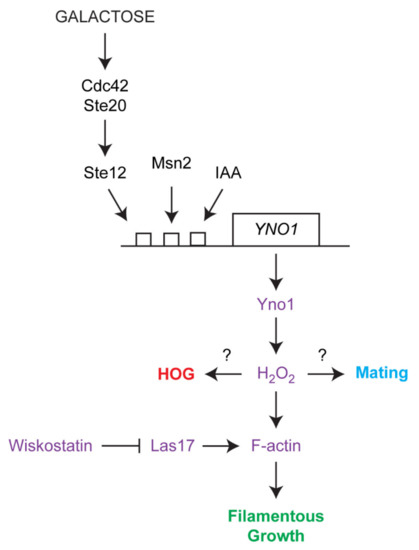 The actin cytoskeleton is also reorganized during morphogenetic responses that are controlled by signal transduction pathways. One example is filamentous/invasive growth, which is controlled by many pathways, including a Cdc42p-dependent MAPK pathway, and which involves reorganization of the actin cytoskeleton (Figure 10) [20]. Fusel alcohols and non-preferred carbon sources that induce invasive growth [27] were also found to induce expression of YNO1. Interestingly, deletion of one of the transcription factors that regulates the fMAPK pathway, STE12, reduced the transcriptional induction of YNO1 to galactose, but not to IAA (Figure 10). Therefore, the expression of YNO1 might be induced by multiple triggers of filamentous/invasive growth.