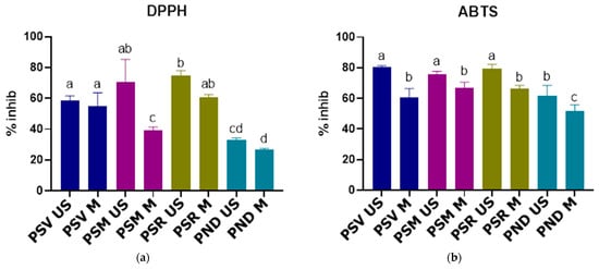 (a) Extract antioxidant activity (AOA) expressed by inhibition percentages (DPPH method); (b) extract AOA expressed by inhibition percentages (ABTS method); different letters indicate significant differences; PSV US—P. sylvestris (Vama) extract obtained by UAE; PSV M—P. sylvestris (Vama) extract obtained by MAE; PSM US—P. sylvestris (Mediaș) extract obtained by UAE; PSM M—P. sylvestris (Mediaș) extract obtained by MAE; PSR US—P. sylvestris (Reghin) extract obtained by UAE; PSR M—P. sylvestris (Reghin) extract obtained by MAE; PND US—P. nigra (Dorohoi) extract obtained by UAE; PND M—P. nigra (Dorohoi) extract obtained by MAE.