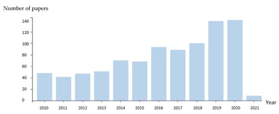 To cover a maximum range of publications from Scopus, Web of Science (WOS), and Google scholar, we screened for the different database terms “essential oils”, “antibacterial”, “anti-inflammatory”, “immunity, “additive”, “diet”, “animal products”, “livestock”, “encapsulation”, and in some cases, combining the primary taxonomic designation and botanical synonym names of plants with the listed key terms. Then, we performed an additional literature search from WOS on EOs in livestock. The total number of articles treating the use of EOs linked with animal production and livestock and their abstract between 2010 and 2021 was 919. The distribution of the number of papers according to the year of publication (2010–2021) is represented in Figure 1.