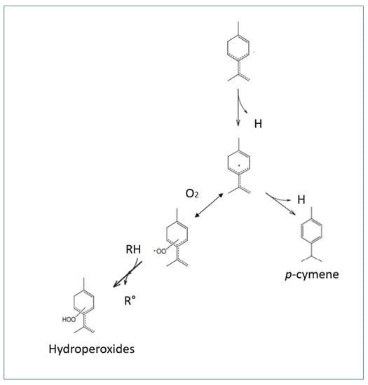Another valorization-limiting characteristic is EOs’ easy oxidation. Once deprived of the protective compartment in the plant matrix, EOs’ constituents are easily prone to different chemical transformations. Indeed, as EOs are both thermo-sensitive and volatile, they are easily alterable [94]. Several factors could be responsible for the degradation of the chemical constituent of EOs. First, the plant’s growth stage and the vegetable material’s post-harvest storage conditions profoundly influence an EO’s alteration. Besides, other factors related to handling or storing the oil itself will also lead to the acceleration of EOs’ oxidation, such as temperature, light, and atmospheric oxygen availability. Indeed, the ultraviolet light and visible light are considered accelerators of the self-oxidation process by taking out hydrogen, leading to alkyl radicals’ formation. The oxidation of terpenoids, for example, produces the p-Cymene (Figure 3). They also give rise to a range of stable oxidized products such as alcohols, ketones, and aldehydes [95].