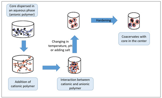 The complex coacervation process: This process involves a liquid–liquid phase separation formed between two or more oppositely charged biopolymers from the initial solution, leading to coacervate formation around the active ingredient [100]. Mixtures between proteins and polysaccharides are generally used to prepare complex coacervates for encapsulation purposes. Encapsulation by complex coacervation can involve various steps for the formation of microcapsules: (i) an aqueous solution is prepared to contain two or more anionic and cationic polymers, (ii) the aqueous phase is mixed with a hydrophobic solution to produce a stable emulsion, (iii) a sudden change in pH and temperature induces the coacervation and the phase separation, and (iv) the polymer matrices harden by using a desolvating agent, high temperature, or a crosslinking agent (Figure 4) [105].