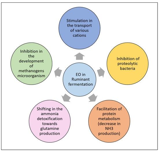 The popularity of EOs in the animal field and health has increased rapidly during the last decade. Nevertheless, their antioxidant and beneficial immunomodulatory effects in the ruminant sector remain poorly explored [15,16]. Mostly in poultry and pig sectors, studies have highlighted the capacity of some EOs to increase animal performances and efficiency by enhancing digestive secretions [17], increasing the number of probiotic bacteria such as Lactobacillus spp. [18,19], stimulating the immune function and the gastrointestinal microbiota [20,21], and decreasing oxidative stress [20]. However, some inconsistencies regarding the efficacy of EOs still exist, mainly linked to the nature of the compounds and some intrinsic and extrinsic factors, such as infection, nutritional status, environment, and particularly, diet composition [22].