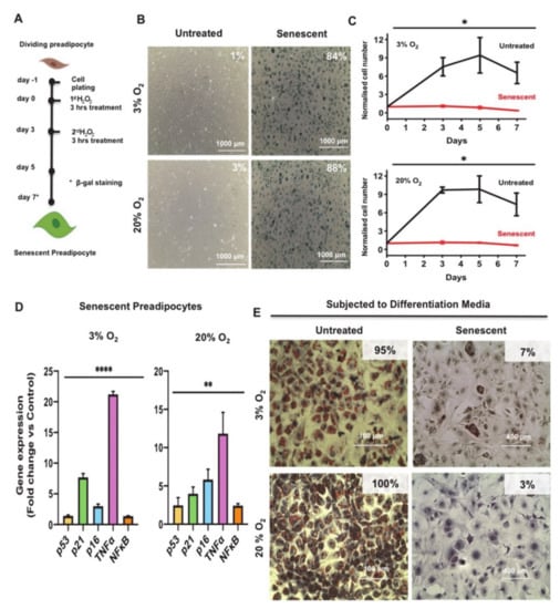 Cellular senescence is also characterized by permanent growth arrest [34]. To monitor changes in cellular growth in H2O2 treated vs. control cells, we performed growth curve analysis on these cells over a period of 7 days. Preadipocytes were treated with H2O2 (200 µM) according to our scheme shown in Figure 1A. Untreated control cells were grown in parallel at either 20% or 3% O2. Cell counts were recorded at the indicated time point (Days 0, 3, 5, and 7) under the respective O2 growth condition. Data in Figure 1C clearly show that H2O2 treatment resulted in arrested growth relative to the untreated regardless of the O2 growth condition.