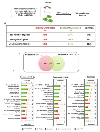 Transcriptomics analysis reveals common senescence signalling pathways in senescent preadipocytes grown at 3% O2 or atmospheric 20% O2 conditions. (A) List of the number of statistically significant transcriptomics changes in senescent preadipocytes grown at either 3% O2 or 20% O2 and the number of common genes between the two conditions compared to their respective untreated control. Highlighted in red and green are the numbers of up-regulated and down-regulated gene products respectively. (B) Venn diagram shows the overlap of genes between senescent preadipocytes cultured at 3% O2 and atmospheric O2. (C) 10 most significant canonical pathways that are altered in senescent preadipocytes grown at 3% O2, atmospheric O2, and common genes as indicated. Axes show percentages of overlapped genes in each pathway and p-value of overlap (Ingenuity Pathway Analysis (IPA) generated). Highlighted in red and green is the percentage of up-regulated and down-regulated genes products in each pathway, respectively.