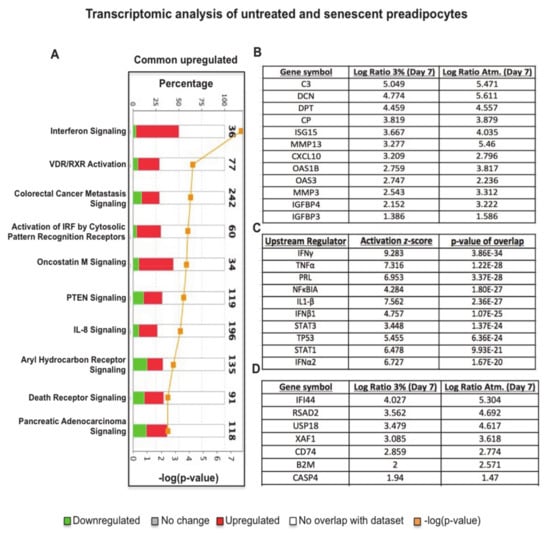To identify common molecular and cellular pathways that were altered in senescent preadipocytes grown under 3% or atmospheric O2, we compared the two datasets and identified a total of 2453 common genes, of which 1317 were up-regulated and 1136 were down-regulated (Figure 2A,B). We subjected the total differentially regulated genes in these conditions along with common genes to IPA. Interestingly, the top ten most significant pathways were the same under the three analyses, which included DNA damage response pathways and cell-cycle regulatory pathways (Figure 2C). Our transcriptomics analysis helped us to identify differentially altered molecular pathways that were consistent with known and well-characterized growth arrest molecular pathways associated with cellular senescence. This analysis also highlighted a focused common set of senescence genes between the two oxygen growth conditions to consider for enrichment analysis to uncover critical and essential factors in driving senescence and sustaining SASP.