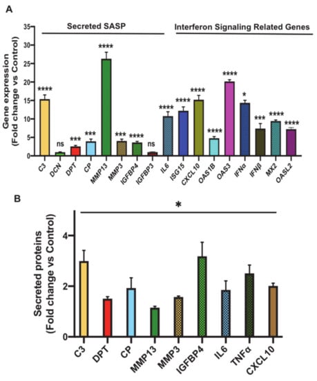 The following are available online at (https://www.mdpi.com/2076-3921/10/2/334/s1), Table S1: Table of primers used for gene expression analysis. Figure S1: Validation of upregulated SASP by dot blot. Figure S2: Graph for STAT1/3 protein quantification. Figure S3: ANOVA analysis for interferon signaling related genes in cGAS and STING knockout cells. Figure S4: Graph for protein Quantification. Figure S5A/B: Graph for protein quantification and Gene expression analysis for SASP molecules.