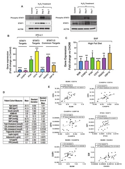 STAT1 and STAT3 activation in senescent preadipocytes and gene expression validation of their targets in senescent 3T3-L1, stromal vascular fraction (SVF) and human adipose fat tissues. (A) Western blot analysis of phospho-STAT1 (Y701), STAT1, phospho-STAT3 (Y705), STAT3 in proliferating and H2O2 treated preadipocytes at different time points. Actin was used as a loading control. (B) Gene expression analysis of the most significantly upregulated STAT1/3 targets in senescent preadipocytes by real-time qPCR. Results (fold change vs. control) are presented as means ± SEM from three independent experiments. ** p ≤ 0.01, *** p ≤ 0.001, **** p ≤ 0.0001 (Student’s t-test). (C) Gene expression analysis of STAT1/3 targets in SVF of high-fat diet mice by real-time qPCR. Gene expression results (fold change) are presented as means ± SEM from three independent experiments. * p ≤ 0.05, ** p ≤ 0.01, *** p ≤ 0.001, **** p ≤ 0.0001 (Student’s t-test). (D) Table of patient cohort measures selected for the study. Body Mass Index (BMI), Homeostatic Model Assessment for Insulin Resistance (HOMA-IR), Systolic Blood Pressure (SBP), Diastolic Blood Pressure (DBP), Mean Arterial Pressure (MAP), Low Density Lipoprotein (LDL), High-Density Lipoprotein (HDL). (E) Correlation analysis of STAT1/3 targets gene expression data in human adipose tissue.