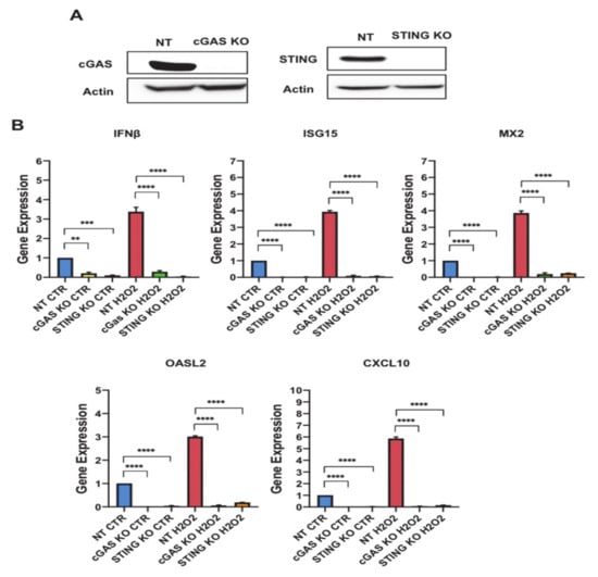 Interestingly, our analysis also unveils the differentially expressed transcriptome in senescent preadipocytes, where the most significantly up-regulated canonical pathway is interferon signaling. Several recent reports have shown that interferon signaling can be activated in response to SASP induction following the initiation of cGAS-STING signaling [55]. In brief, following a response to DNA damage, cytosolic self-DNA escapes into the cytosol where it is recognized by the cGAS-STING pathway, which then stimulates the production of interferons and inflammatory factors [55]. The SASPs activated by interferon signaling following the activation of cGAS-STING include CXCL10 and genes that play a critical role in interferon signaling, including IFNβ, ISG15, MX2, and OASL2 [56,57,58,59,60]. In our study, we evaluated the mRNA expression of these genes in oxidative stress conditions in preadipocytes in the absence of cGAS and STING. We reported that CXCL10 and interferon signaling-related genes were significantly down regulated in these conditions, which indicated that they are regulated by the cGAS-STING signaling in senescent preadipocytes. However, several studies have reported a different role for interferon-stimulated genes in their response to cGAS signaling [61,62]. For instance, Ghosh et al. reported a distinct regulation by OASL2 through inhibiting the activity of cGAS to limit interferon induction [61].