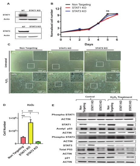 Next, we performed knockout experiments using CRISPR-Cas9-mediated deletion of STAT1 and STAT3. Notably, our data demonstrated distinctive effects when compared to their phenotype in oxidative stress-induced senescence. STAT1 deletion in preadipocytes showed reduced sensitivity to senescence growth arrest characterized by the reduction of acetylated p53 and p21, whereas deletion of STAT3 reduced the survival of senescent preadipocytes. Interestingly, we demonstrated an induction in the levels of both the phosphorylated and total protein forms of STAT3 following STAT1 deletion in control preadipocytes. On the other hand, phospho-STAT1 levels were increased upon the deletion of STAT3 levels. We also showed that STAT3 deletion resulted in an induction of acetylated p53 and promoted the activation of p21, furthering cell growth arrest. We speculate that during oxidative stress, the activation of STAT1 inhibits the downregulation of the p53/p21 axis governed by STAT3 through suppressing STAT3 function. A recent study by [63] reported that inhibition of STAT1 and STAT3 did not rescue cells from TNFα-induced senescence, led to increased p21 expression, and suppressed genes involved in interferon gene expression.