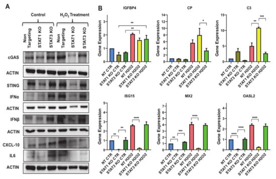We also performed gene expression analysis to monitor the changes in interferon signaling related genes (e.g., ISG15, MX2, OASL2) as shown in Figure 8B. The expression of these genes in H2O2-treated STAT3 KO preadipocytes was similar to NT senescent preadipocytes. However, the data revealed a significant reduction in the mRNA levels of these genes (ISG15, MX2 and OASL2) in STAT1 KO preadipocytes compared to NT and STAT3 KO preadipocytes, denoting the importance of STAT1 in regulating the expression of these molecules in senescent preadipocytes. In summary, these findings demonstrated an inverse function of STAT1 and STAT3 in regulating cGAS-STING signaling and the downstream interferon signaling-related genes in oxidative stress.